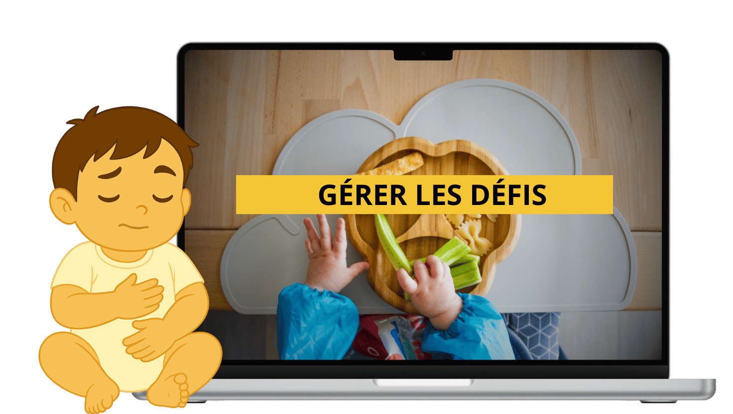 Votre bébé est dans sa chaise haute, curieux. Vous posez devant lui quelques bâtonnets fondants. Il attrape, porte à la bouche, mâchouille, sourit. Vous respirez. Pas de bataille de cuillère, pas de sprint en cuisine. Vous savez quoi proposer, sous quelle texture, et en quelle quantité. Vous êtes là, vraiment — présent(e), détendu(e), en train de partager ce moment qui compte.
